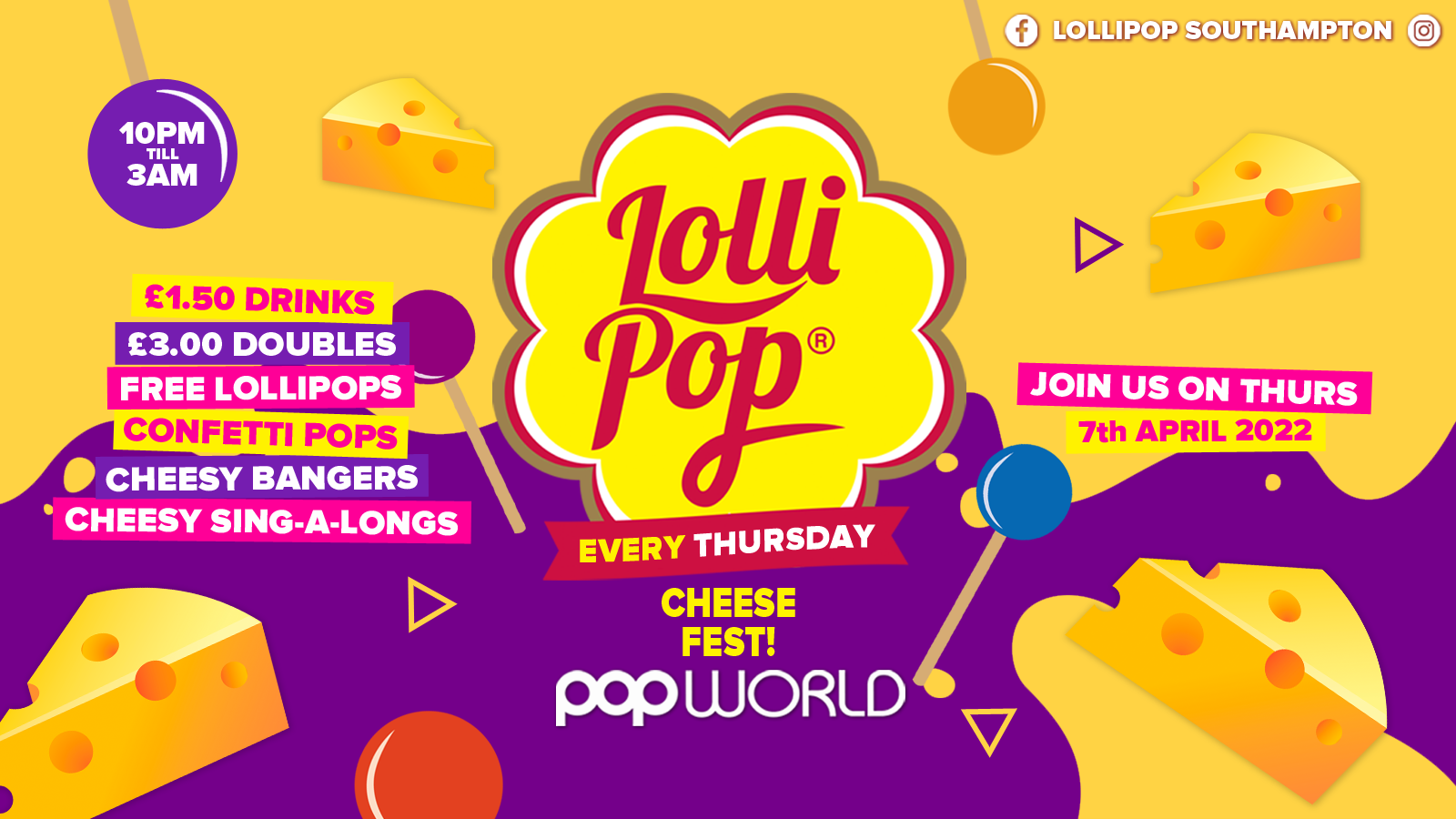 Lollipop Thursdays • Cheese Fest • £1.50 Drinks • Popworld